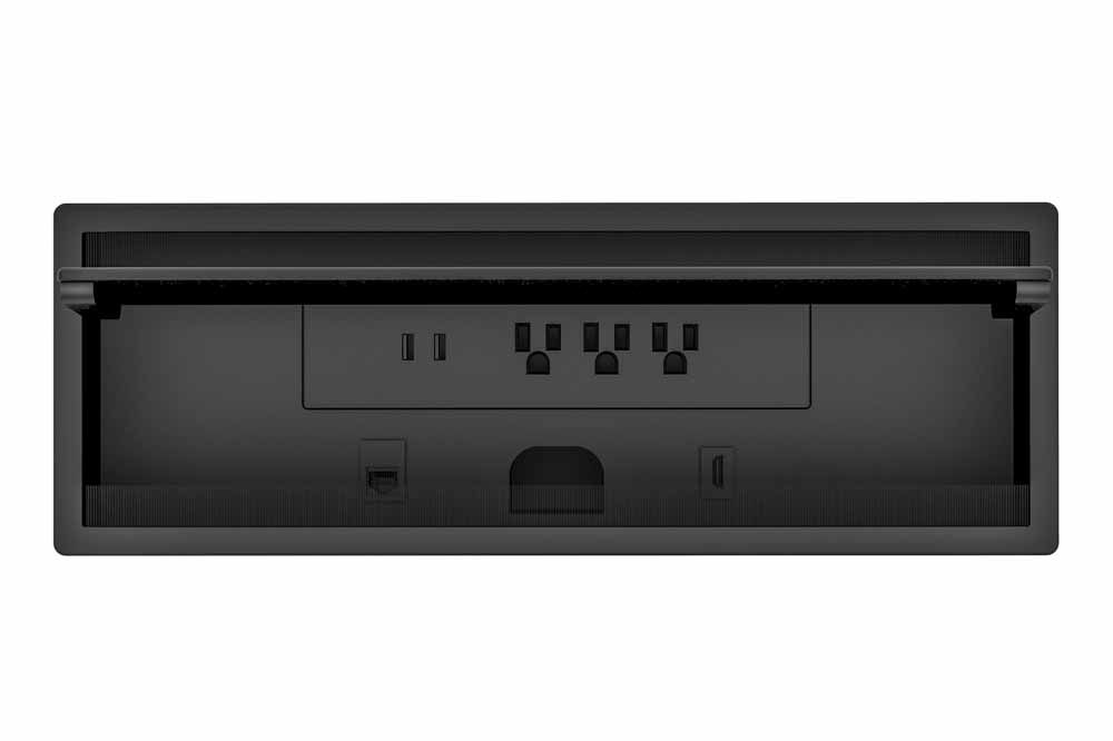 The Cable Cubby features three AC receptacles coupled with two USB charging ports, CAT6 and HDMI coupler. The cover may be opened from either side of the table and a wire management brush that allow the cover to close while cables are in use.