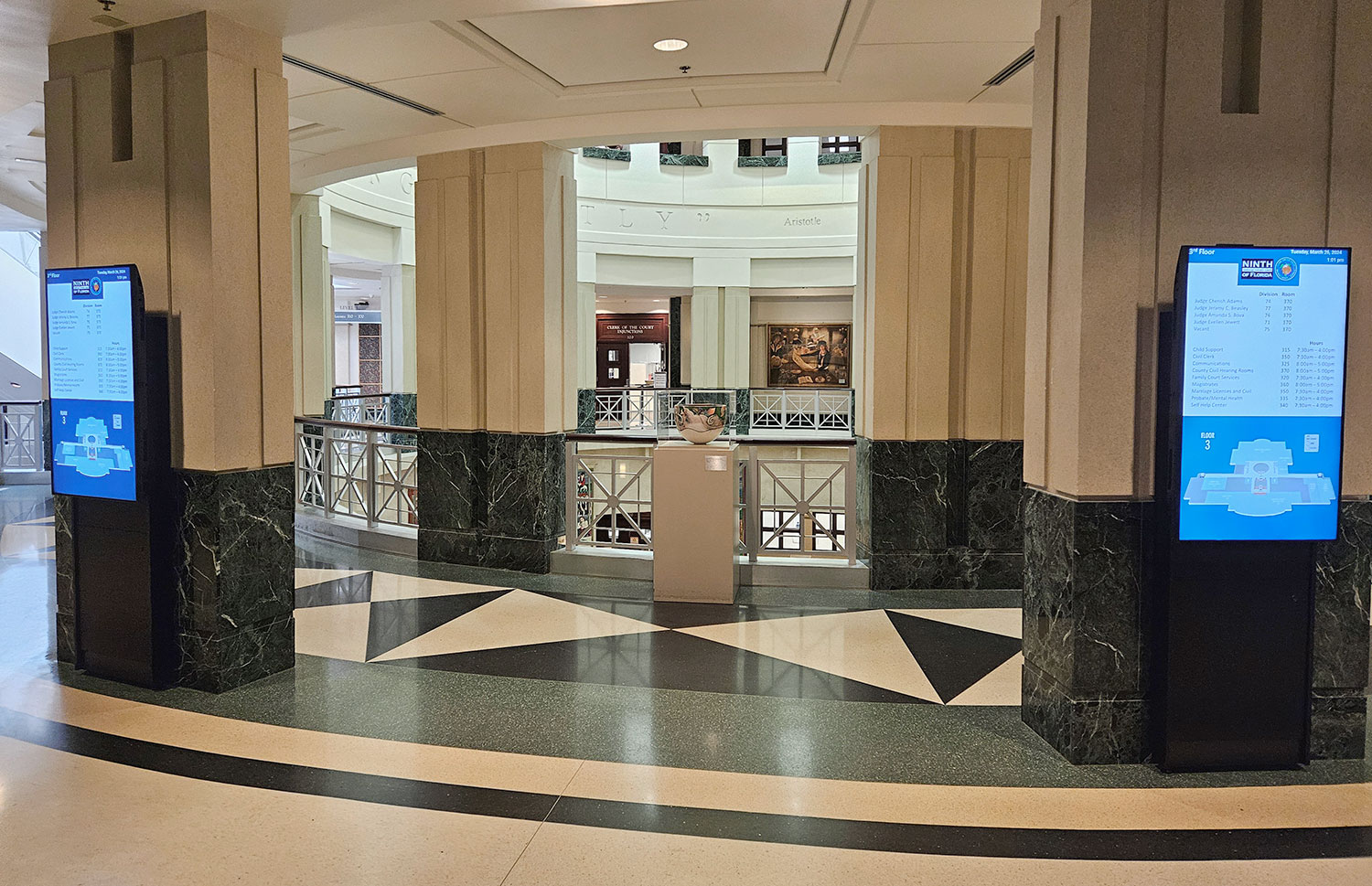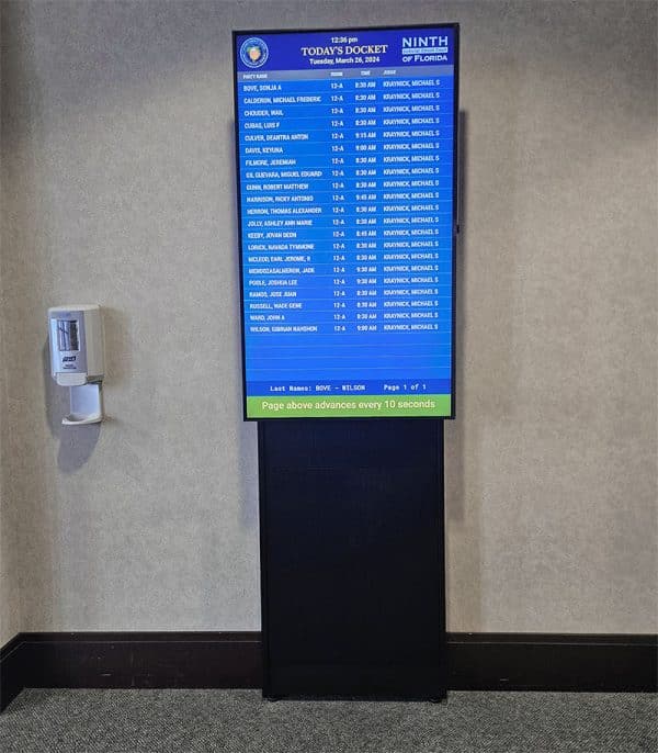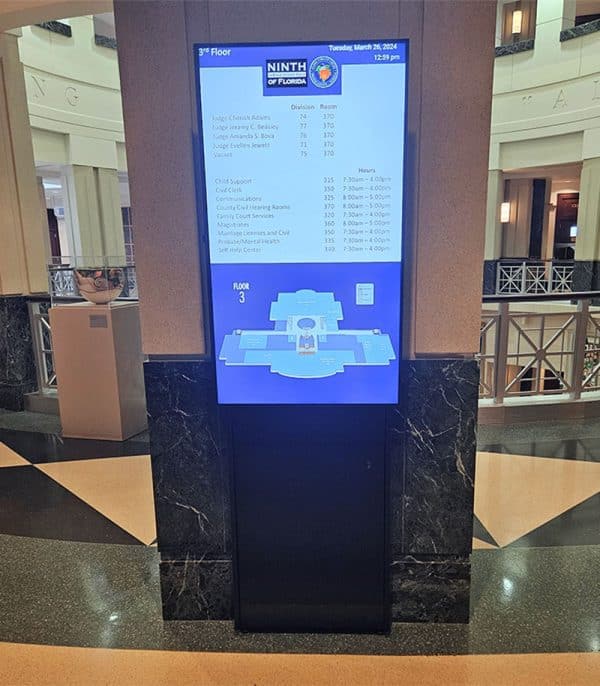 Für die Wegweiser-Displays dient der Eingangsbereich des Ninth Circuit als Ort für Selbstbedienungsinformationen, ähnlich wie an Flughäfen, wo Besucher schnell den Standort ihres Gerichtssaals und die benötigten Informationen finden können. Es sind bereits über 28 Salamander Strut Walls installiert, weitere werden in Kürze folgen. Einige ältere, schöne Säulen in diesem Bereich bestehen aus Materialien, die nur minimal gebohrt werden können und keine schweren Lasten tragen können. Da die Salamander Strut Wall nur zwei Schrauben benötigt und das gesamte Gewicht unten liegt, war dies die perfekte Lösung. Bald wird es vor jedem Gerichtssaal eine geben.
