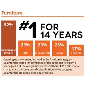 Die Zahlen für jeden Hersteller spiegeln die Anzahl der CE Pro 100-Händler wider, die diese Marke verwenden. Salamander liegt mit 52 % an der Spitze und hat mehr als doppelt so viele Händler wie sein nächster Konkurrent. Diese Zahlen werden laut CE Pro genau beobachtet, „da es sich um die erfolgreichsten Unternehmen der Branche handelt“. Viele professionelle Integratoren betrachten die von diesen Unternehmen verwendeten Marken als Zeichen für Erfolg.