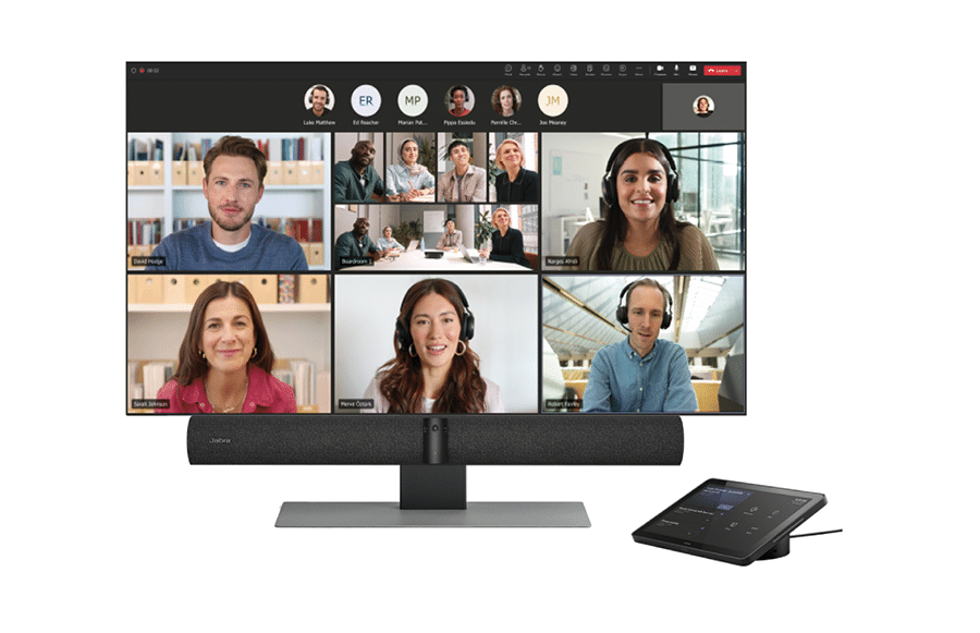 El elemento central del sistema es Jabra PanaCast 50 VBS, una barra de vídeo todo en uno, certificada para Microsoft Teams y diseñada para que las reuniones híbridas se desarrollen sin problemas. Tres cámaras de 13 megapíxeles ofrecen un campo de visión panorámico de 180 grados en 4K, para que todos se vean con claridad, independientemente de dónde se sienten. Ocho micrófonos con formación de haces y cuatro potentes altavoces ayudan a garantizar que las voces se capturen con precisión y se escuchen con claridad. El resultado es una experiencia natural e inclusiva que une a los participantes remotos y los que se encuentran en la sala.