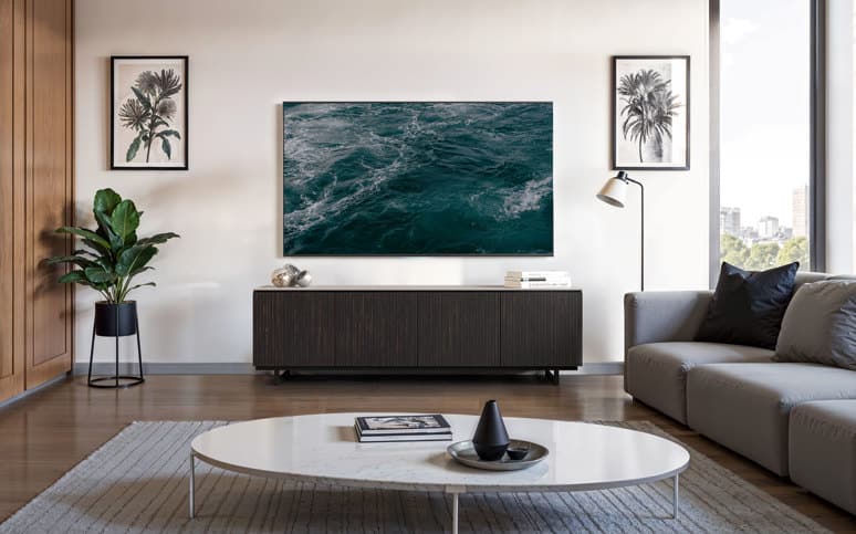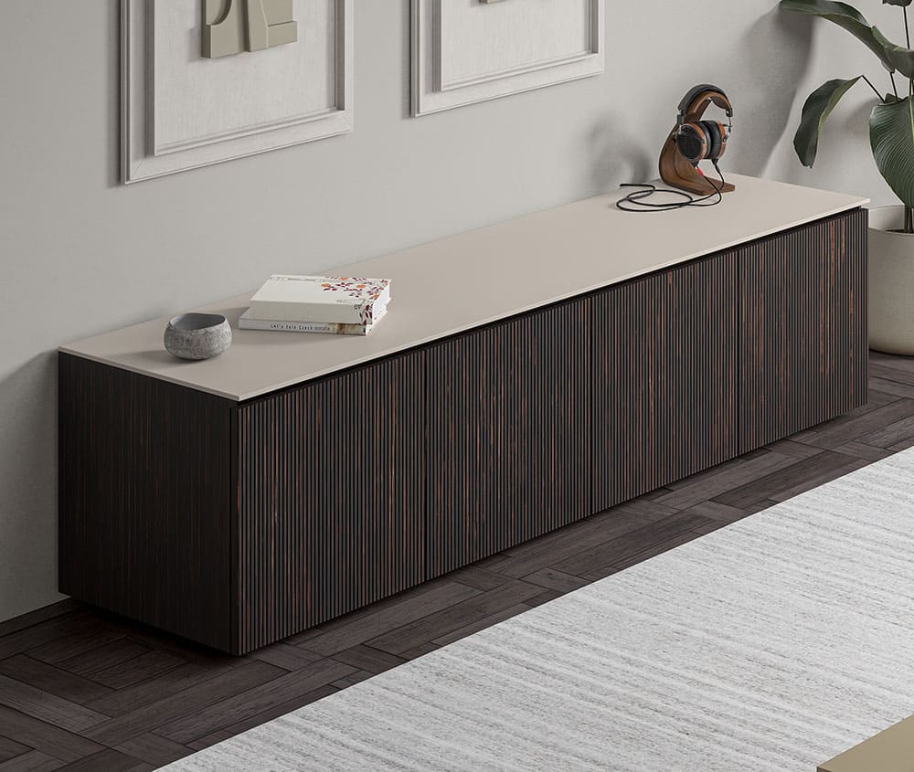 The Manhattan Cabinet caters to diverse style preferences with two elegant finishes. First is Walnut – a warm, timeless colorway that radiates classic appeal, and second is Maro Ebony – a deep, sophisticated tone with delicate striations that add depth and dimension. With two premium top options, integrators and designers can further expand its utility. The Black Glass Top provides a sleek, gloss surface for a clean, modern aesthetic, while the all-new Taupe Etched Glass Top delivers a soft, matte, non-reflective finish offering warmth and understated sophistication.