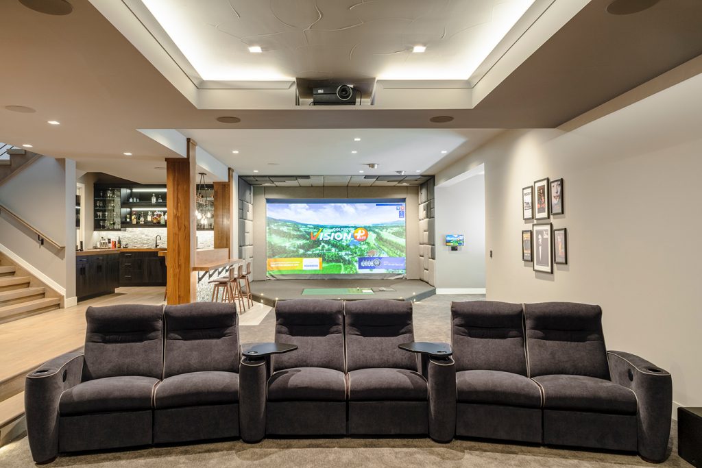 “We had a very large Barco Projector going in for video in the theater area of a room,” Mac explained. “This basement room shared both the golf simulator and the home theater. Because we were brought in early, we saw that if the soffit was extended just a small amount, we could put the projector entirely into it so that it’s quiet and always out of sight. We worked together with the builder, and the client was extremely happy about this adjustment.”