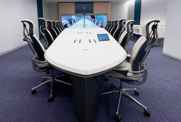 Born of a recent partnership between Cisco and Salamander Designs to enhance Cisco’s Webex Room Panorama, and now available to all integrators and designers, the new Infiniti Tables are supported by an exclusive, sculpted steel pedestal base that employs a unique extruded aluminum frame system. The new table shape and solution provides today’s most seamless Webex Room Panorama experience to make it feel as if everyone is in the same room in a hybrid meeting. Also achieving official Cisco Certification, the striking design accommodates Cisco plus any unified communications (UC) system and technology to take today’s business meetings and collaboration to a more personal and involved level. The cable infrastructure traverses the entire length of the table and spans top to bottom where the pedestal reaches the floor. Participants can meet and work without distracting cables, cords and other equipment. Optional brackets can attach to the frame rails to allow installation of power distribution units or other peripherals neatly below table.