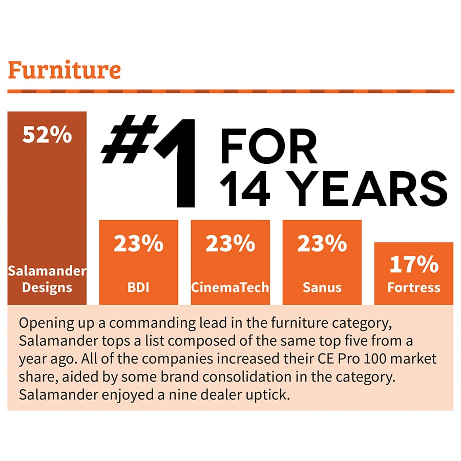 Choix privilégié des intégrateurs résidentiels et commerciaux, Salamander a été classée première marque de mobilier audiovisuel pendant 14 années consécutives dans l'analyse annuelle des marques CE Pro 100.